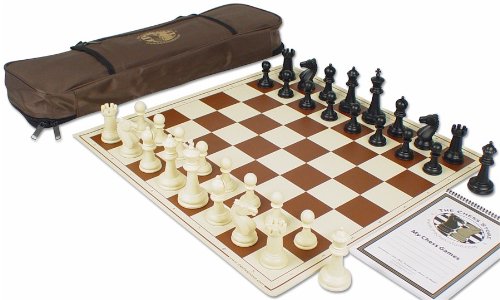 This complete tournament chess set kit includes our Guardian Plastic Chess Set, Rollup Chess Board, Deluxe Chess Bag, and Score Book. Our Guardian plastic chess set blends a contemporary and unique knight with other pieces that are traditional Staunton design. This triple weighted chess set has a 4" king and an extra wide base that measure 1.75". The heavy weighting in the base makes a low center of gravity giving pieces a great feel and stability. This chess set has become a favorite for both kids and adults.