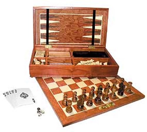 Includes chess (1 1/4" squares, 2 1/2" King), checkers, backgammon, cribbage, dominoes, playing cards, and poker dice. 12" Folding inlaid wood chess/backgammon game board. Wood dice cups. Magnetic closure. 12 3/4" X 7" X 3". Read more...