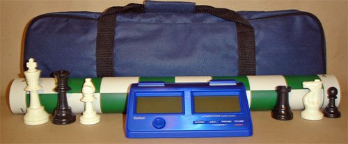 This complete tournament chess set kit includes our Guardian Plastic Chess Set, Rollup Chess Board, Deluxe Chess Bag, and Score Book. Our Guardian plastic chess set blends a contemporary and unique knight with other pieces that are traditional Staunton design. This triple weighted chess set has a 4" king and an extra wide base that measure 1.75". The heavy weighting in the base makes a low center of gravity giving pieces a great feel and stability. This chess set has become a favorite for both kids and adults.