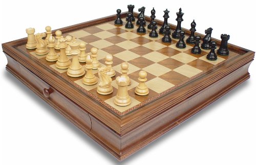 This chess set package includes our New Exclusive Staunton chess set in ebonized boxwood and boxwood matched with a beautiful walnut chess case! Our New Exclusive Staunton chess set has all of the features that avid chess players and collectors looks for in an upper-end Staunton chess set. From its elegant profile with a large tapered base to the extraordinary knights carved by some of the best craftsmen in the world, the quality of our premium chess sets stand out from the rest! As you can see from the photo, the black ebonized chess pieces contrast beautifully against the walnut and maple of the chess board. As with most of our chess sets, 2 extra queens are included. The chess case is made from solid walnut and other wood veneers and has two large drawers, one on each players side. The drawers will hold chess sets with a