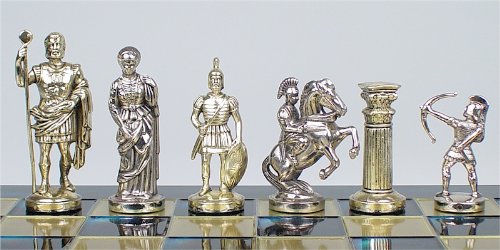 This beautiful brass and nickel chess set from Manopoulos is based on the Greek and Roman cultures and their military conquests. The pawns are represented by row of archers from which this chess set has its name. Chess pieces are hand-cast in solid zinc and then brass and nickel plated. Chess pieces are then lacquered to keep the lustrous finish from ever tarnishing. This chess set is also available in complete chess set package includes the Manopoulos chess board and wood case for storage.