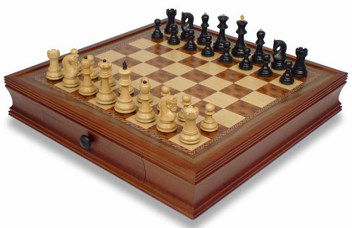 As you can see from the photo, the black ebonized chess pieces contrast beautifully against the walnut and maple of the chess board. As with most of our chess sets, 2 extra queens are included. The chess case is made from solid walnut and other wood veneers and has two large drawers, one on each players side. The drawers will hold chess sets with a king base up to 1 5/8" diameter. An unbeatable value at this price!